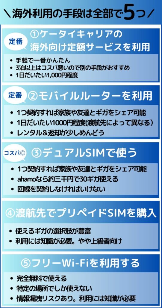 今回はスマホの海外利用についてまとめました。海外利用の手段には、次の5つがあります。