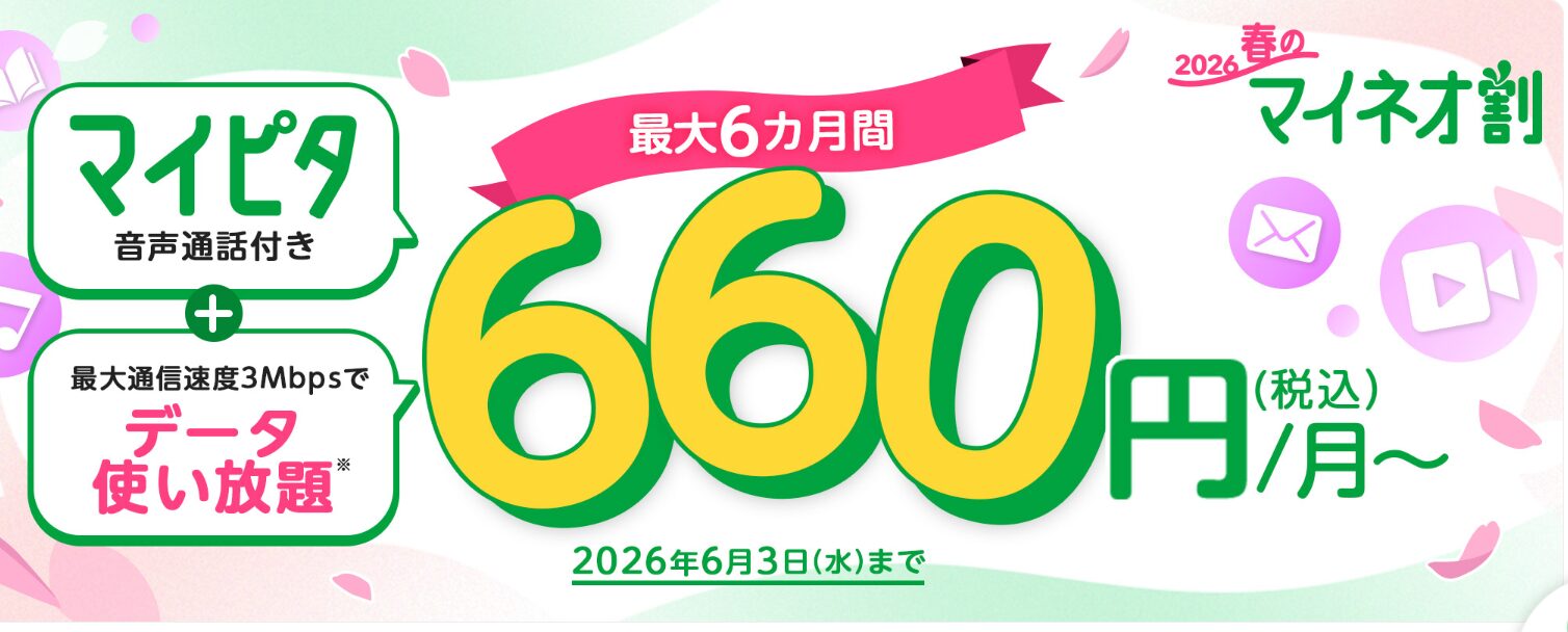 | マイピタ1~50GB 最大6カ月間638円割引 キャンペーン ![]() |