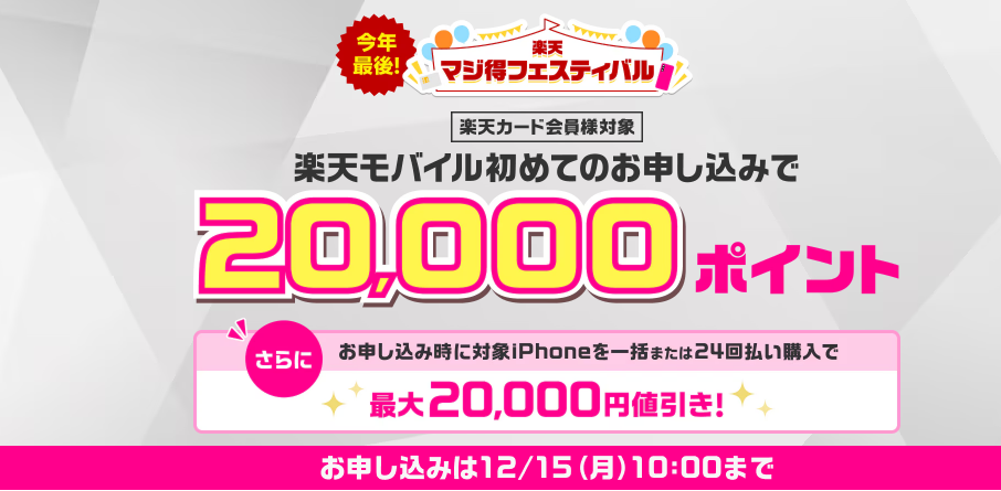 楽天マジ得フェスティバル!/【楽天カード会員様対象】楽天モバイル初めてお申し込みで20,000ポイント
