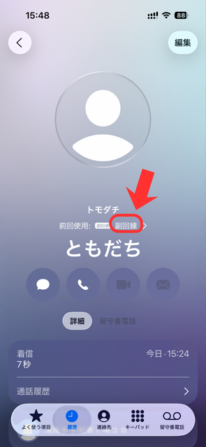 電話に出たあとも、相手の名前の上に「副回線」と表示されます。