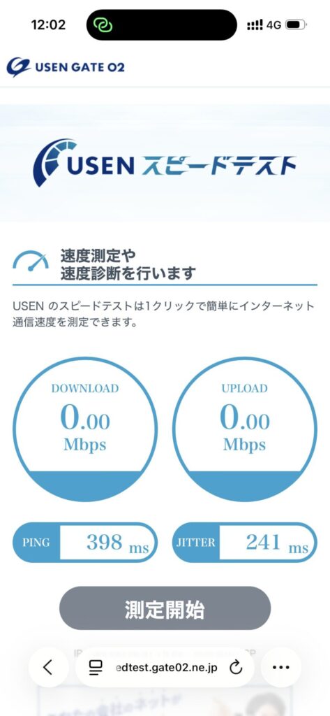 いちおうスピードテストしたところ、やはり0.00Mbpsでした。Pingがヤバい数値になってますね。