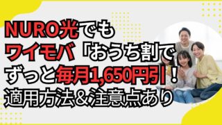 ワイモバイル NURO光はワイモバイルのおうち割(A)が対象!適用方法と注意点を詳しく解説 ワイモバイルの光セット割「おうち割(A)」は、対象はソフトバンク光だけだと諦めていませんか?実は、ワイモバイルのおうち割はNURO光も対象です。本記事では、ワイモバイルでおうち割(A)対象のNURO光の内容や、おうち割を適用する方法を解説し... 2025.10.07 ワイモバイル光セット割