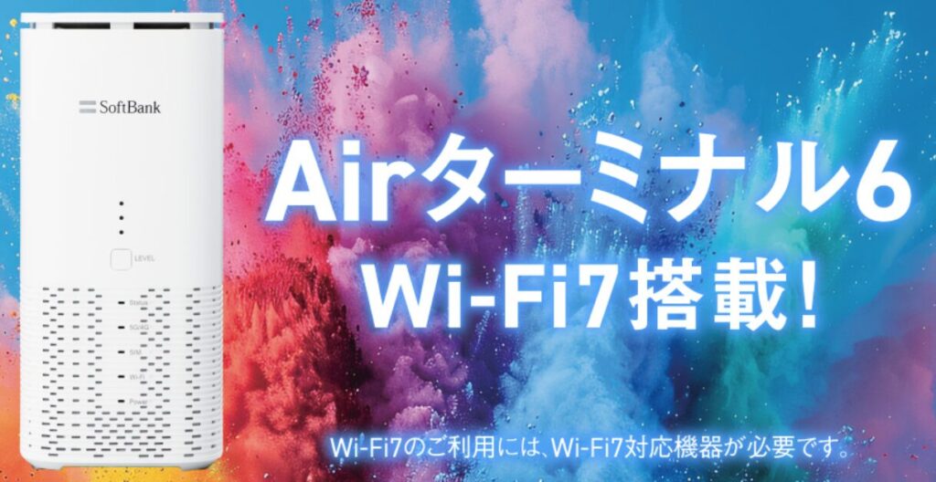 ソフトバンクAirは、ソフトバンクが提供するモバイル回線を利用したホールルータータイプの固定回線です。コンセントに挿すだけで利用開始できるため、工事は必要ありません。最新モデルのホームルーター「Airターミナル6」は、5G対応・Wi-Fi7対応・下りの最大速度は2.7Gbps・アンテナ4本搭載の超高スペックで安定性と速度に優れています。もちろんデータは使い放題。